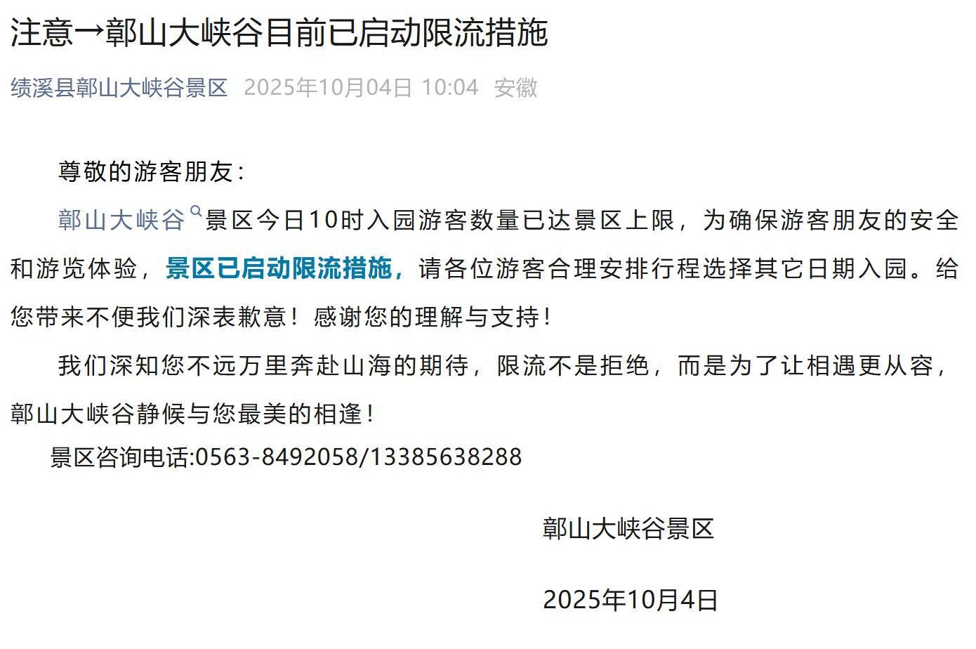 大皖新闻讯 10月4日上午,位于绩溪县境内的鄣山大峡谷景区发布《注意→鄣山大峡谷目前已启动限流措施》的信息,内容显示:景区今日10时入园游客数量已达景区上限,为确保游客朋友的安全和游览体验牛博士,景区已启动限流措施,请各位游客合理安排行程选择其它日期入园。