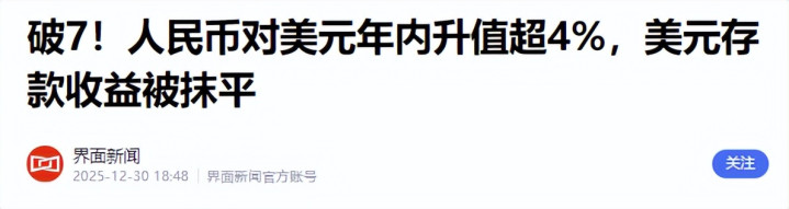 这两年人民币对美元涨得挺猛,2025年末,汇率一度跌破7,年内升值超4%。